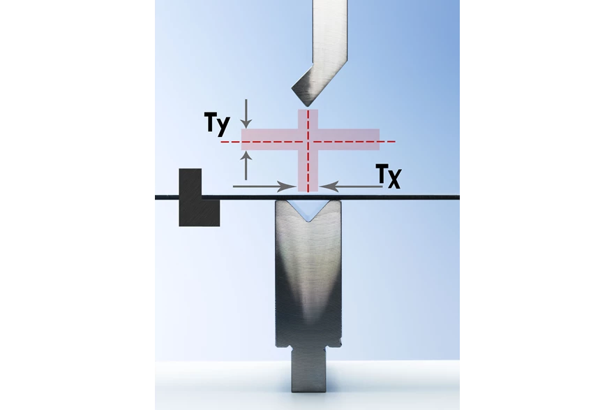 To achieve this, the tool system on the press brake should allow for local adjustments in the horizontal plane (Tx). This will ensure exact and parallel flanges. To ensure a consistent angle along the entire bend, local adjustments in the vertical plane (Ty) should also be possible.